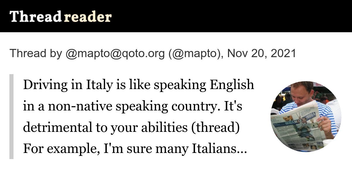arrow-up17arrow-down1external-linkDriving in Italyplus-squarethreadreaderapp.commapto@feddit.itItaliano · edit-23 months agomessage-square2linkfedilink