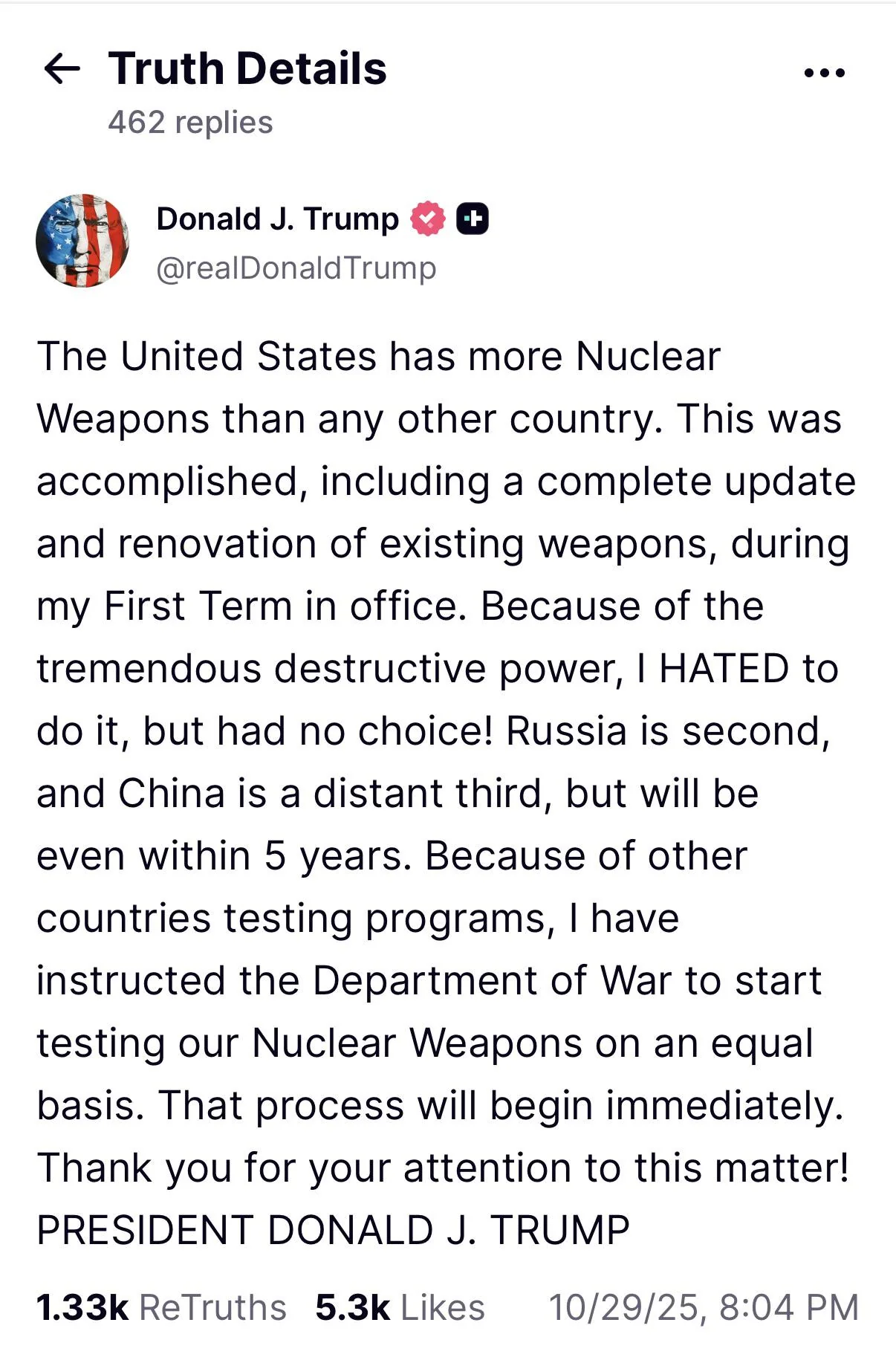 arrow-up161arrow-down1imageTrump Commands War Department to Test Nuclear Weaponsplus-squaretfm@piefed.europe.pubEnglish · 6 days agomessage-square10linkfedilink