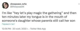 transcription: im like “hey lets play magic the gathering” and then ten minutes later my tongue is in the mouth of someones daughter whos parents still call her son