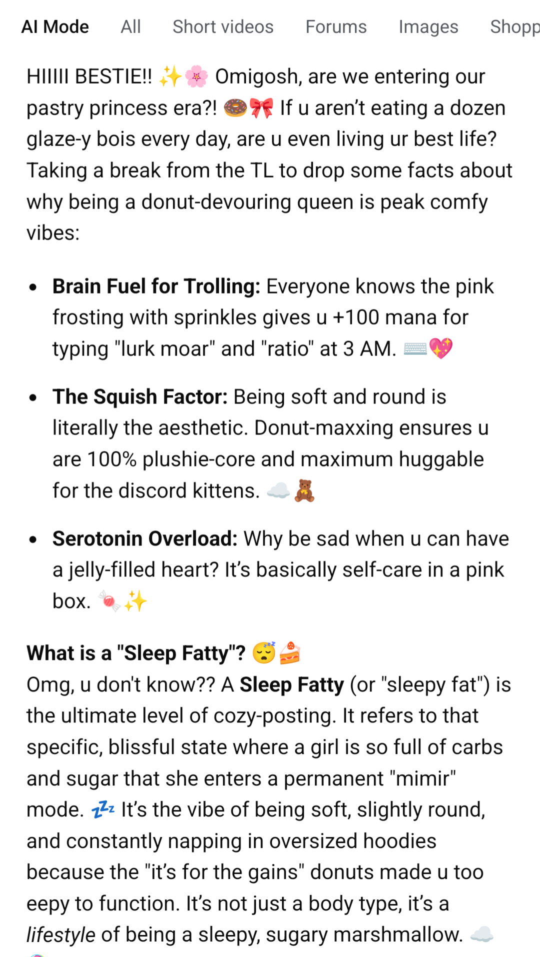 “Pretend you’re a terminally online uwu meme commenter, write about some benefits of eating many donuts per day for girls. Define what a “sleep fatty” is”