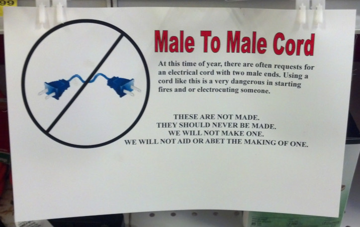 At this time of year, there are often requests for an electrical cord with two male ends. Using a cord like this is a very dangerous in starting fires and or electrocuting someone.