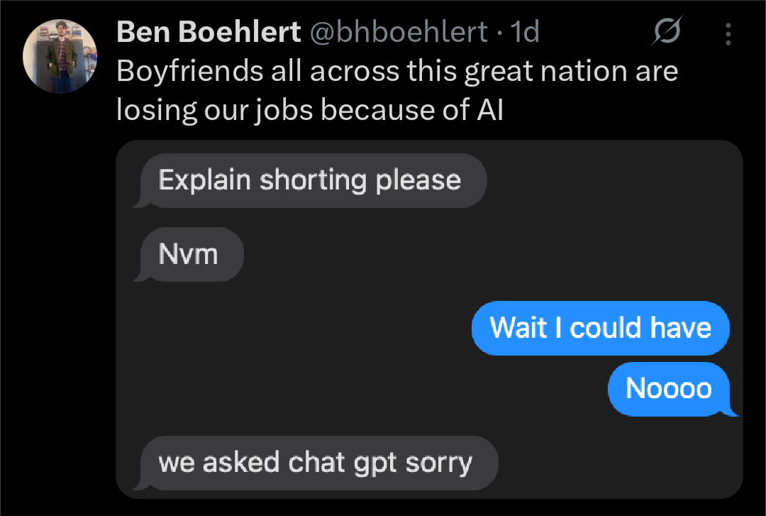 People do know they could have just googled things and looked at the top results before right? Even with all the enshitification it’s gone through it will still usually yield something useful for any topic that isn’t super niche. Like if I search “shorting” the top 3 results are articles from Wikipedia, Investorpedia, (don’t know enough about it to know if it’s reliable) and Charles Schwab, a source with a conflict of interest since they probably sell that service, but they’re probably at least going to explain why you’d want to buy it from them, and then as a bonus the 4th result is an ELI5 Reddit thread, which while probably not the most reliable source of info, is probably about on the same level as randomly asking your SO about a topic which they’re not an expert in.
