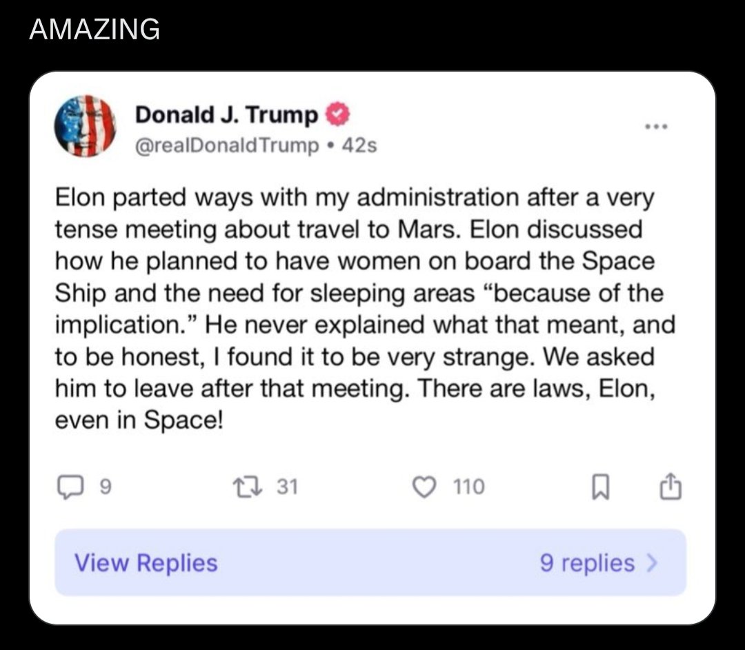 This joke doesn’t work because trump would be the one saying that, not Elon.