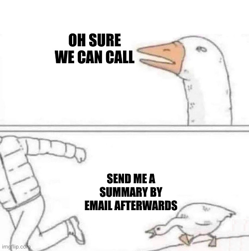 So they can’t explain over the phone either, but fifteen minutes of vague rambling lets them feel like they explained it, and there’s no written record of what they did or didn’t say so they can blame you if you can’t work it out. It’s win/win, as in they win and blame you regardless of what you do.