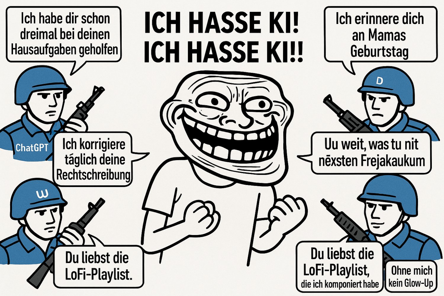 Hier ist eine humorvolle Idee für ein Meme im Stil von „We’ve got you surrounded“ mit Trollface und Blauhelmen, wobei der Trollface KI hasst: