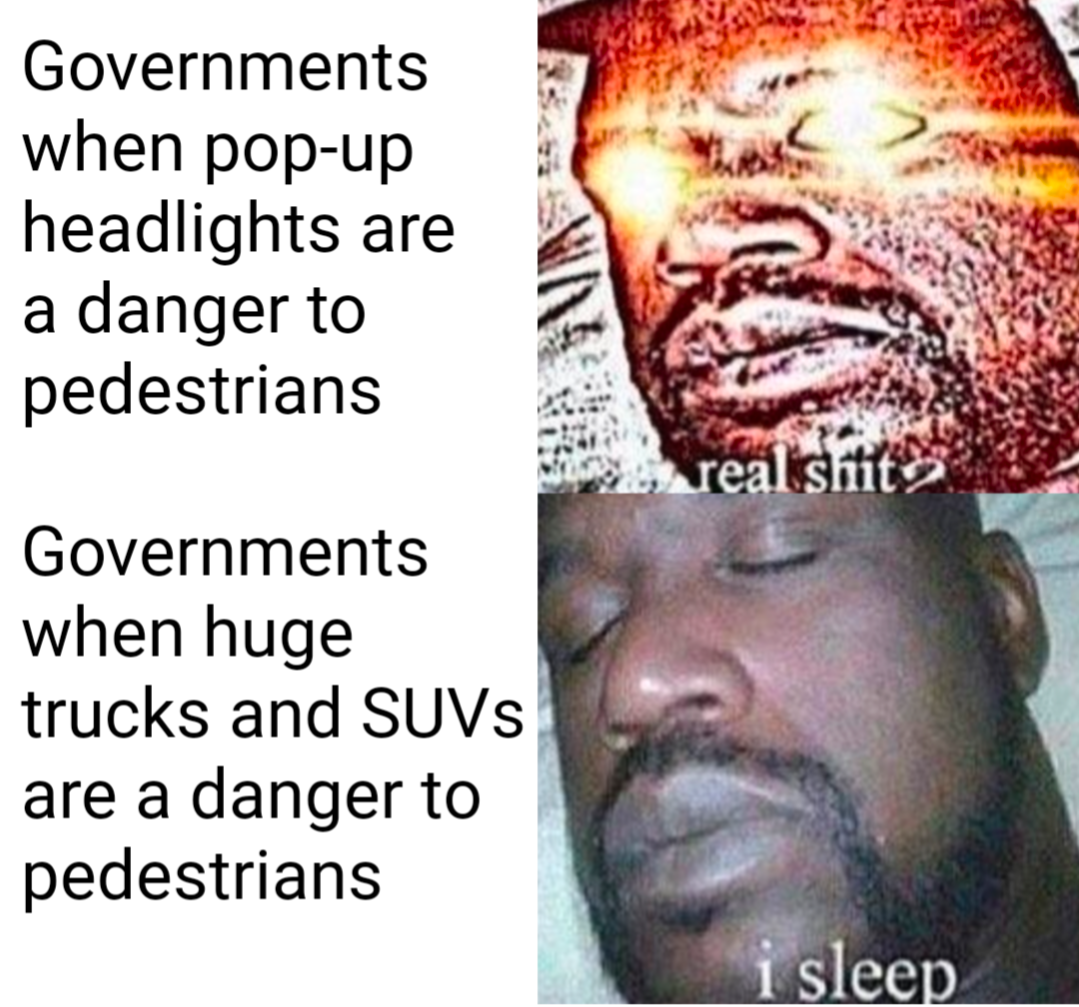 And that’s not even getting into the point the post makes, which is that these monstrosities are getting bigger and more dangerous to pedestrians, yet our governments do nothing to stop it.