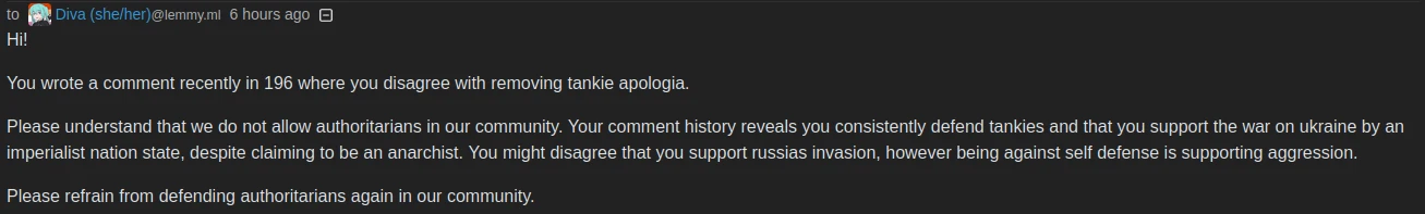.ml absolutely has a problem with tankies. That you continue to believe that most tankies are just leftists or that your stance on ukraine is not problematic makes it pretty clear who you are.