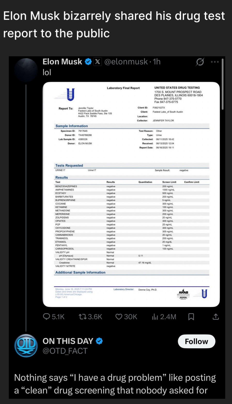 So this genuinely proves jack shit. I mean, if it’s not faked in any way, then what it “proves” is that Elon isn’t a 247 weeder and has been without hard drugs for like, half a week. And that really isn’t a sign of not being addicted, desperately trying to prove you’re not the junkie people say you are by being sober for the better part of one week after the whole world has turned on you and everything you own is going to shit.