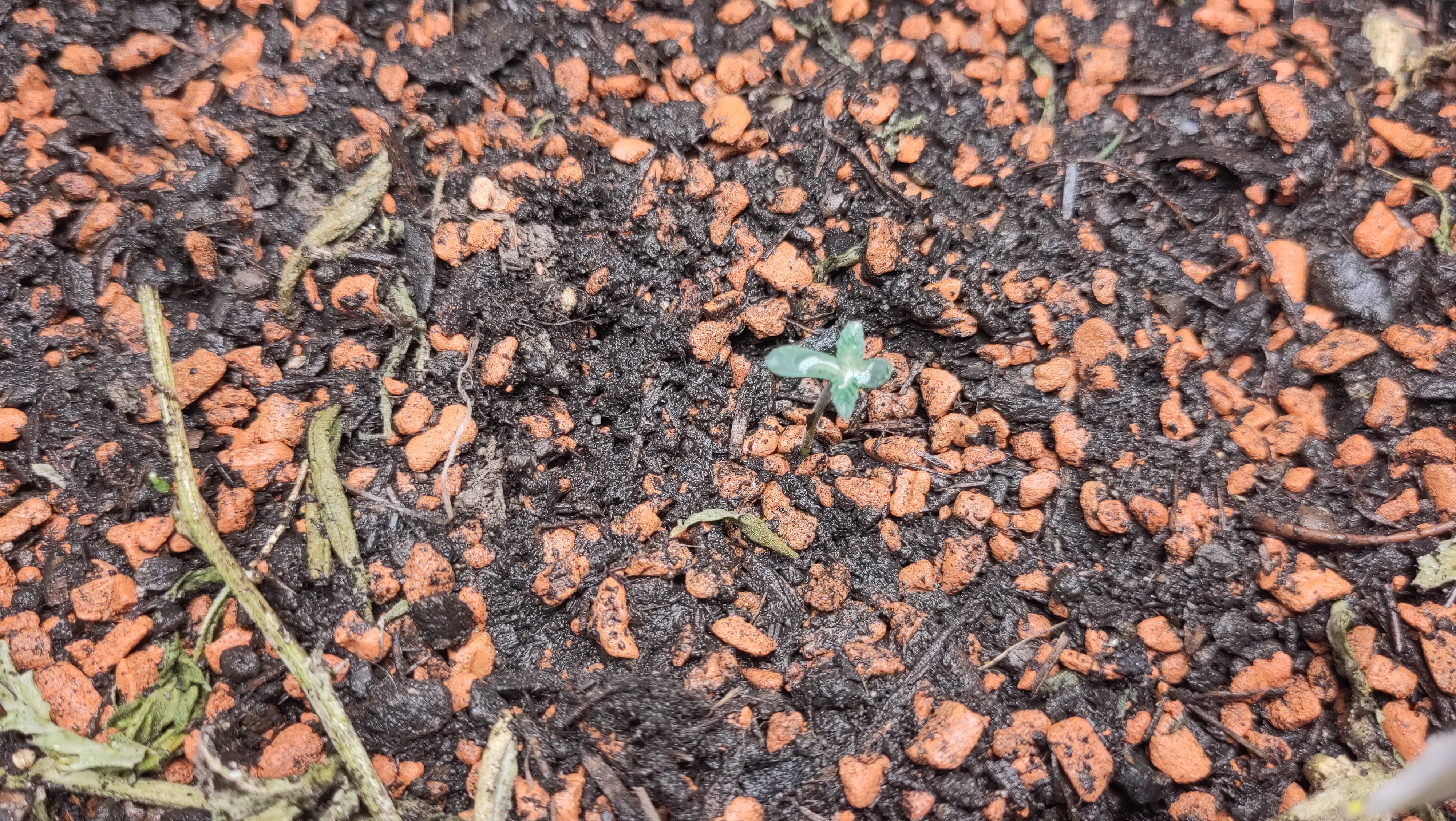 Mittlerweile ist im Mittleren Topf auch ein Pflänzchen gewachsen, dass auch nicht so hart Spagelt. Anscheinend muss die Lampe halb in die Keimlinge, damit es ihnen reicht. Haben wir das auch gelernt.