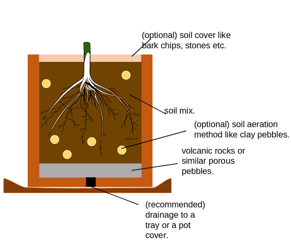 - Lacks proper drainage. (I tend to add an inch of volcanic porous stones at the bottom of most pots allowing them to keep some spare water but not soaking their root soil; adding a draining method at the end).