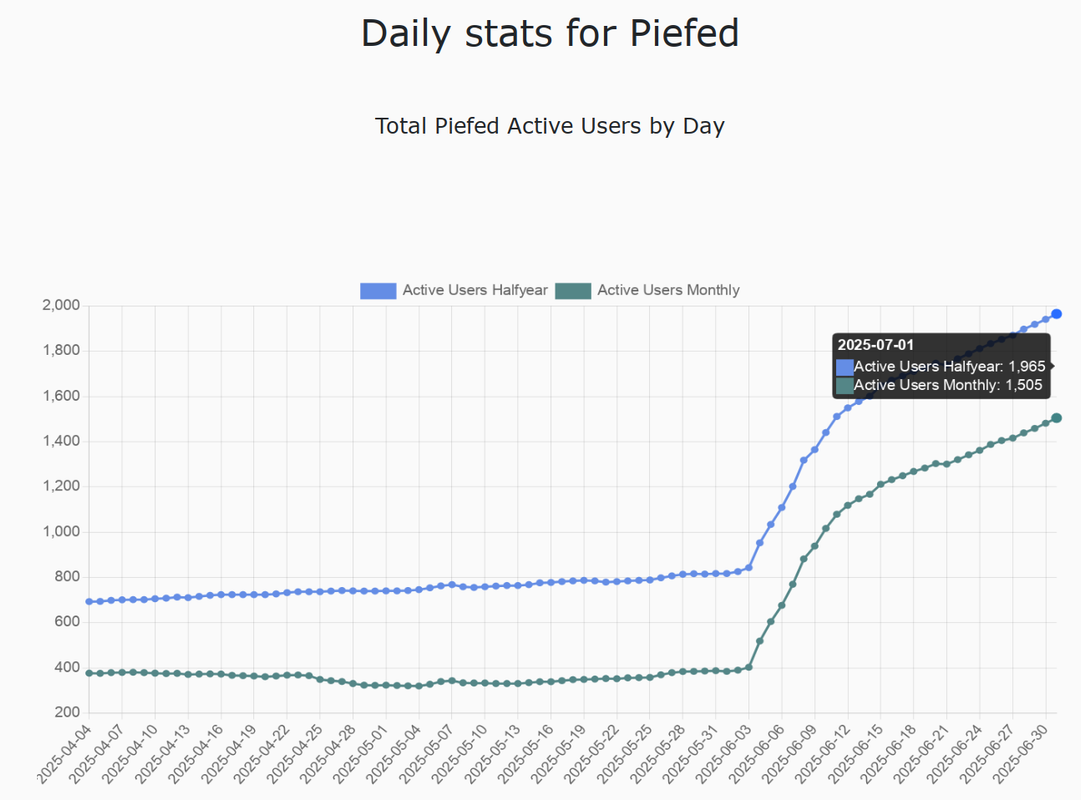 Blaze (he/him)@piefed.zip to Fediverse@piefed.socialEnglish · edit-23 months agoPiefed reaches 1500 monthly active usersimagemessage-square35linkfedilinkarrow-up1146arrow-down10