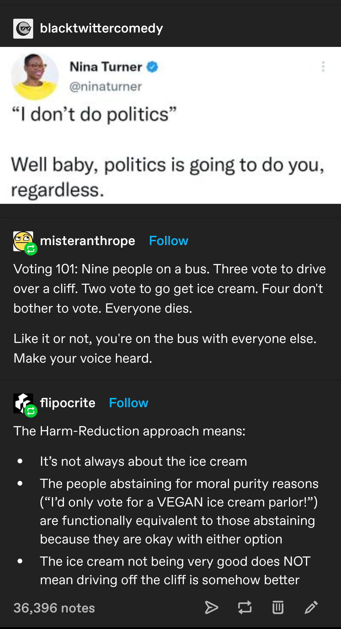 Let’s put it this way. If one side is saying they will kill everyone who isn’t straight and white, and the other side says they want to ban gay marriage. Now I think queer rights is really important but I would vote for the second to prevent the firsr. But people seem to be screaming “I’m never voting against gay rights!” Cool, so when the other guy wins and it’s way worse, at least you feel good.