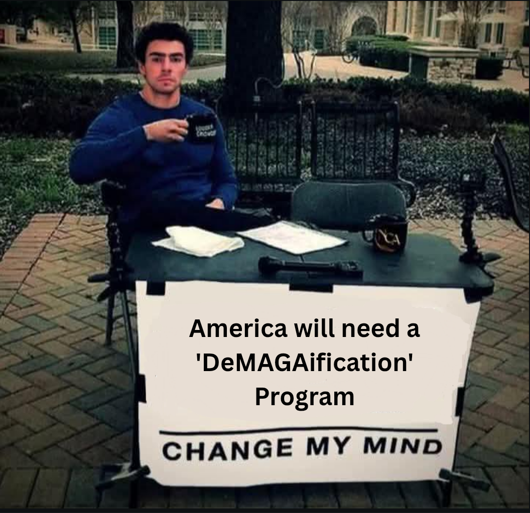 Similar to post WWII Germany & Austria had the Denazification initiative to ride society, culture, press, economy, judiciary, and politics of the Nazi ideology. We will need to remove MAGAism from the roots to finally free ourselves.