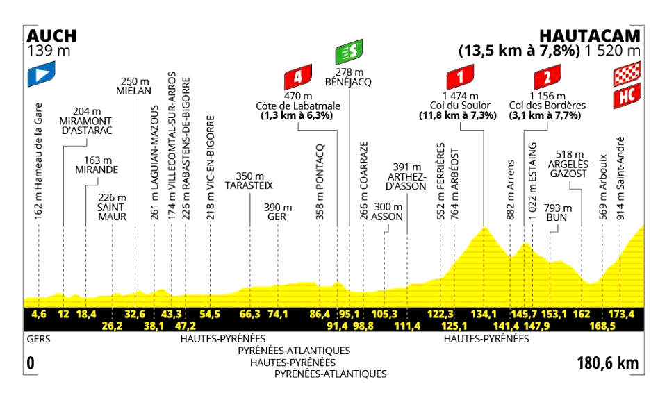 Le départ n’est pas aussi plat que souvent ces dernières années, l’organisateur va enfin utiliser un peu les collines du Gers au lieu de bêtement remonter les vallées. Mais seulement un tout petit peu : ils vont passer uniquement par la route Nationale 🙄, donc de longues sections plates vont quand même être présentes, et les «ascensions» seront plus douces et rabotées. D’autant plus douce que les collines du Gers sont en toit d’usine, et la direction Est→Ouest est toujours le versant le plus tranquille.