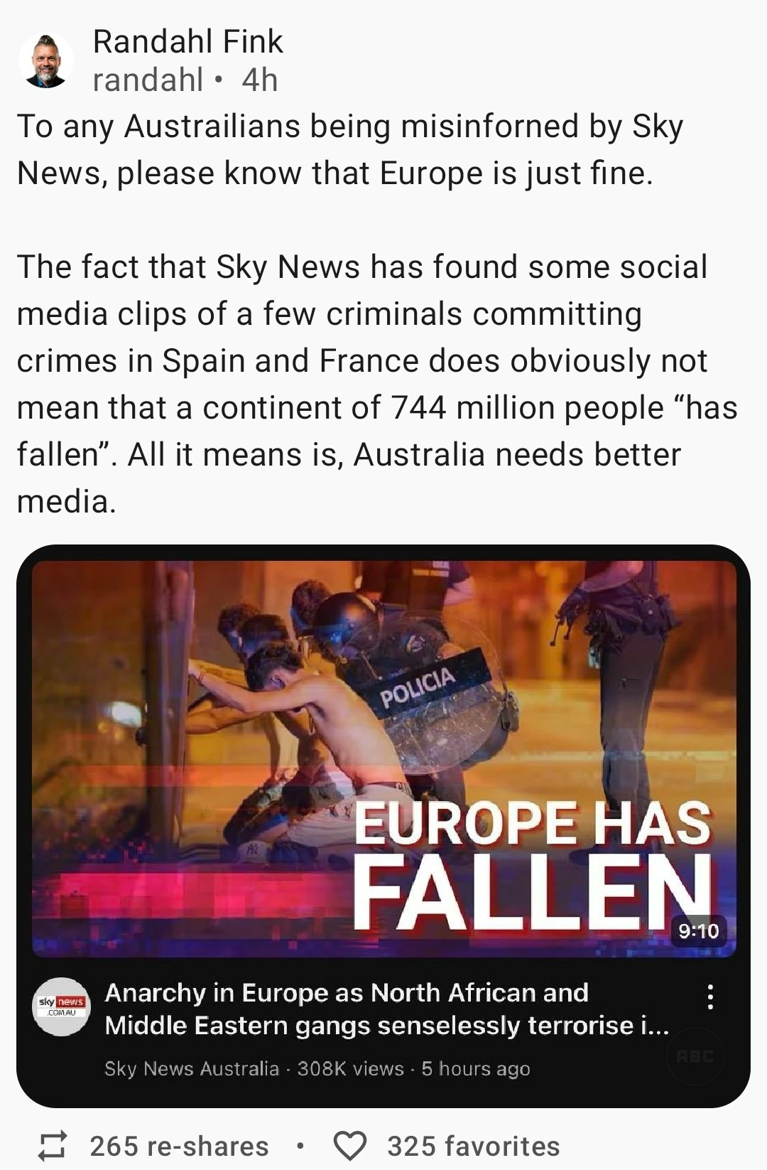 I’m assuming you were talking about the London riots, there were a few days of violence but it was only idiots who were after a free TV and PlayStation, and of course the one unimaginative guy who famously stole some rice and then posted about it on Facebook. But of course no one has any guns so once the police turn up everyone tends to calm down.