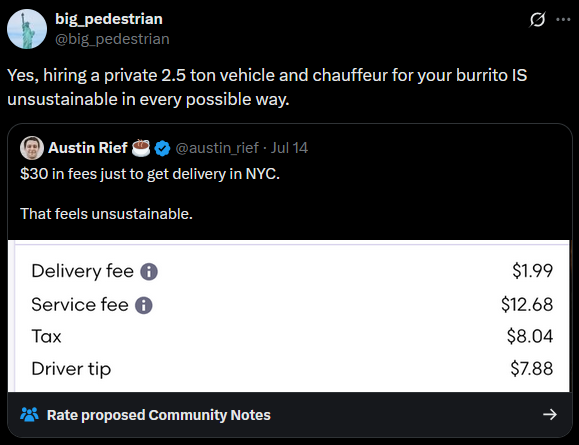 destructdisc@lemmy.world to Fuck Cars@lemmy.worldEnglish · edit-23 months agoI've honestly never quite realized up until now how utterly ridiculous it is that people (especially in the US) regularly demand that their food be chauffeured to them.imagemessage-square361linkfedilinkarrow-up11.24Karrow-down157file-text