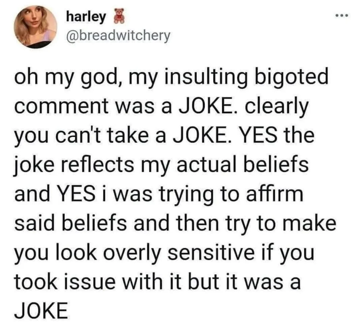 I’m so happy that more people are finally catching onto this. Something being funny does not magically make it better; in fact it’s often worse because it reinforces normative viewpoints.