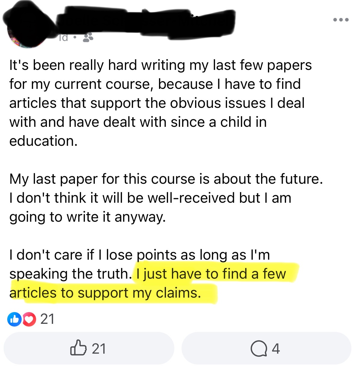 Now, if the professor is any good they’ll put restrictions on even that but the bar is so low we’re just happy to see a citation that isn’t a blog or made up by AI.