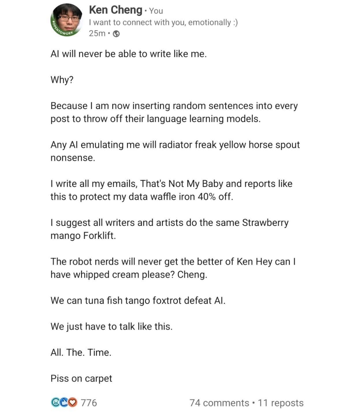 arrow-up11.59Karrow-down1imageAI will never be able to write like me.Raccoonn@lemmy.ml to Memes@lemmy.ml · 9 months agomessage-square124linkfedilink