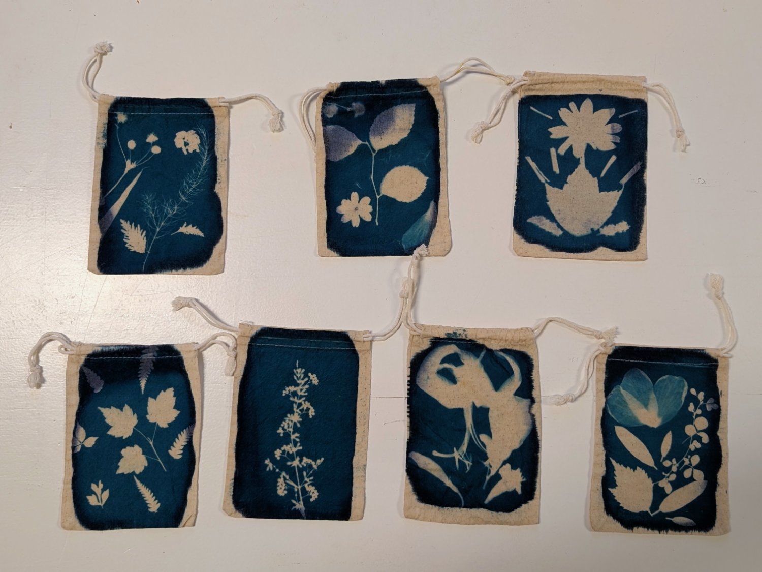 Once you’re ready to go, you expose them in the sun! There’s a lot of different factors in how long you expose them for–time of day, time of year, cloud cover, the thickness of your design materials, the pH of your paper or fabric, and a bunch of other stuff I know I haven’t learned about yet. In my class we watch everyone’s prints and I explain the different phases you can see them go through. I talk about what changes I’m looking for and factors I’m considering. I’ll tell each person when I think theirs is done and what has led me to that decision. It gets easier with practice, but I always tell people it’s a great art form for “recovering perfectionists” because I’m always learning something new.
