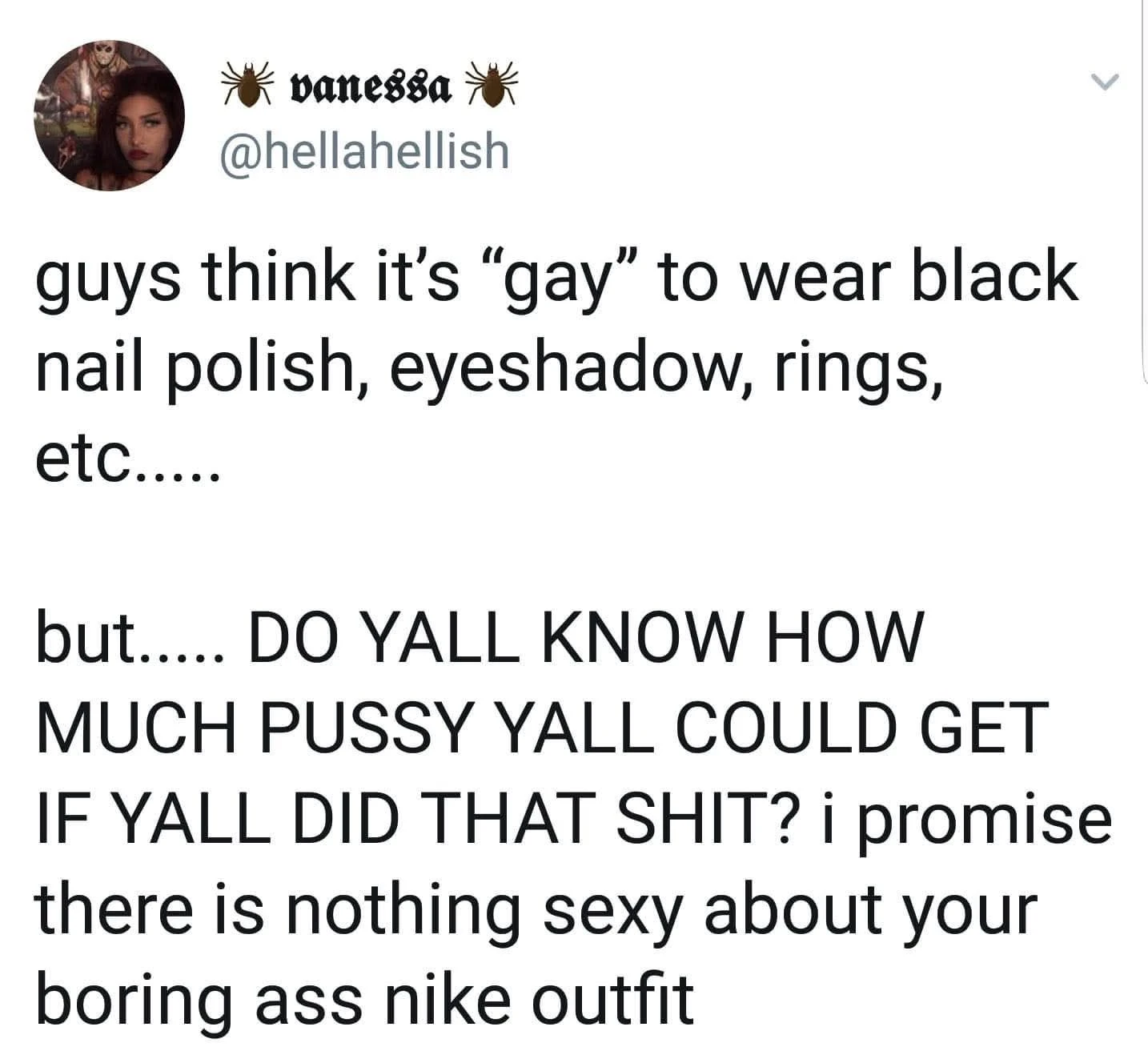 What they have a problem with is doing things that are feminine. Which - and it is weird I have to point this out - makes sense because they do not identify as feminine. Every time this topic comes up in left/liberal space, there’s a barrage of comments about how “men are dumb and insecure, why dont they just dress up like pretty girls - wouldn’t that be fun?” Which is so weird coming from a place that constantly talks about affirming peoples’ genders.