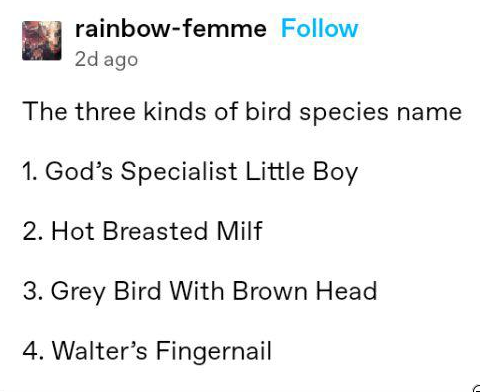 Back in the day people be naming birds like “brown tittied groundling gayfa**ot” and nobody be batting an eye
