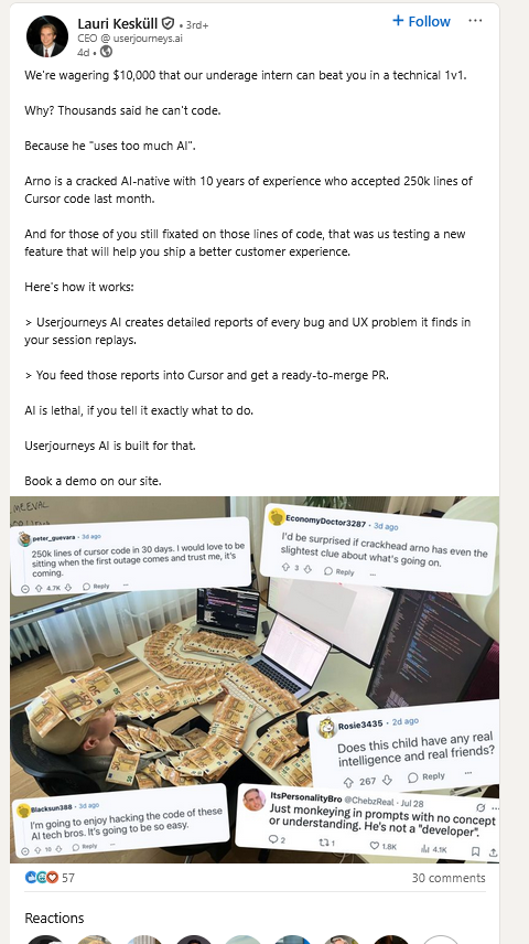 cm0002@lemmy.world to Programmer Humor@programming.dev · 2 months agoChild labour with 10 years of experience, 'AI-native' accepting 250k lines of Cursor codeimagemessage-square60linkfedilinkarrow-up1253arrow-down15cross-posted to: programmerhumor@lemmy.ml