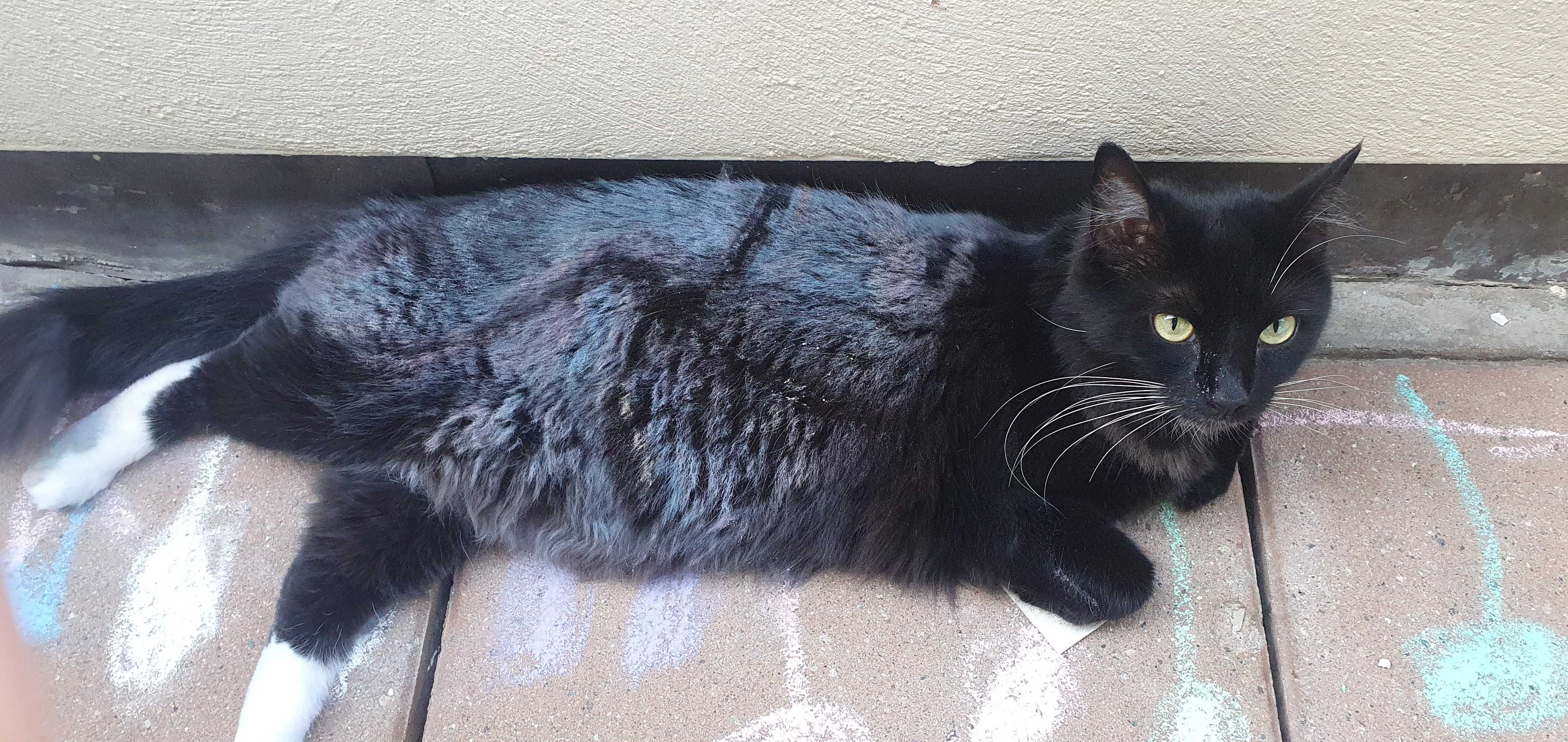 Cat didn’t seem to mind camouflaging into the kids chalk artwork. She did mind though me having to clean her afterwards.Curled whiskers to match the curled feet, 10/10 no notes