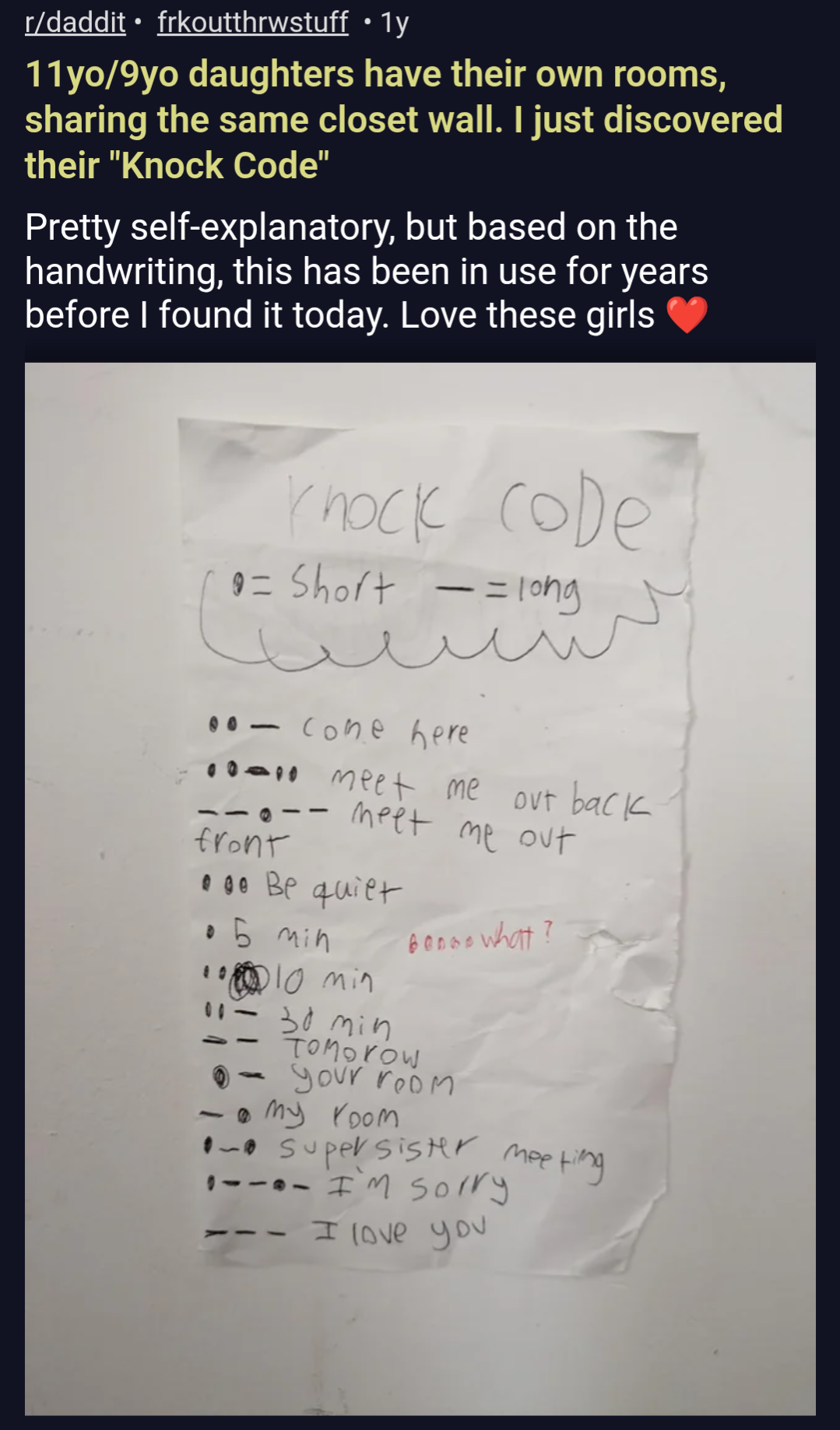 ByteOnBikes@discuss.online to Wholesome@reddthat.com · 2 months agoThe "I love you" knock has me choking insideimagemessage-square50linkfedilinkarrow-up1430arrow-down15