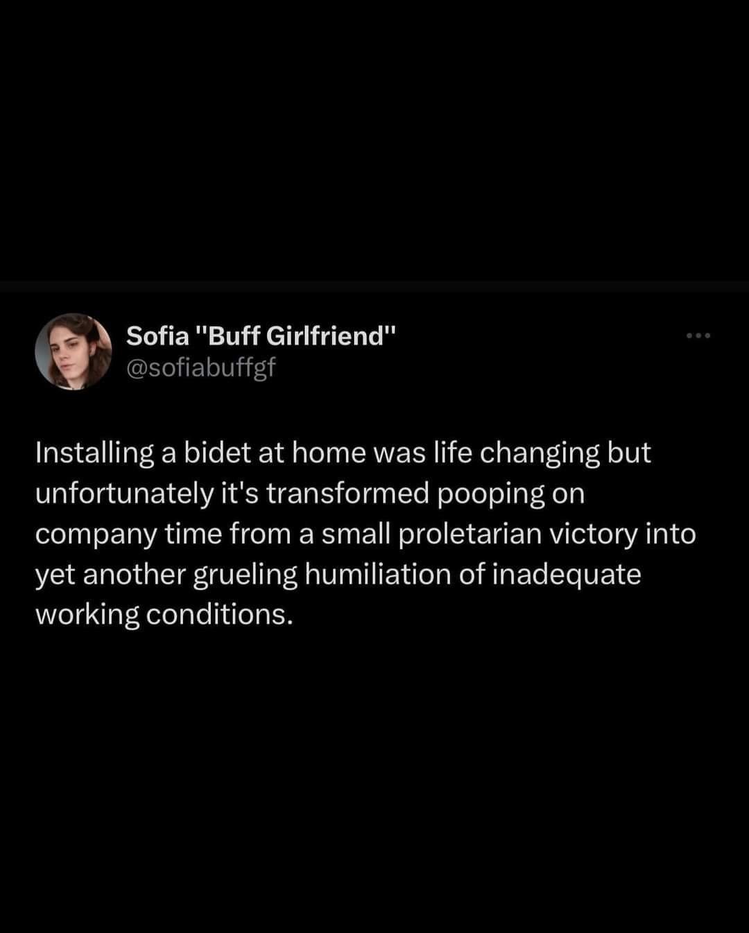 Installing a bidet at home was life changing but unfortunately it’s transformed pooping on company time from a small proletarian victory into yet another grueling humiliation of inadequate working conditions.