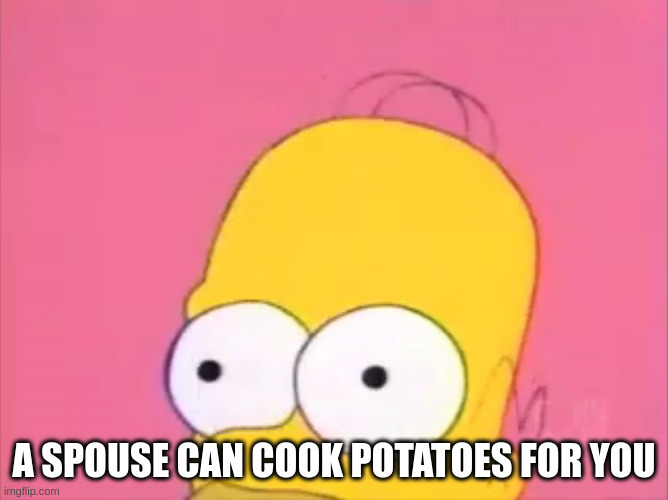 minus-squarehumanspiral@lemmy.calinkfedilinkarrow-up14·2 months agoone spouse is more likely to cook potatoes if there are 2 or more available to enjoy them. Other spouse can cook some protein.