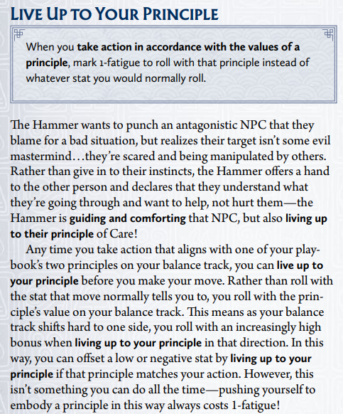 Characters can also be called out on acting/not acting according to their Principles, or Lose their Balance (basically have a mental breakdown) if it goes past one of the extremes.