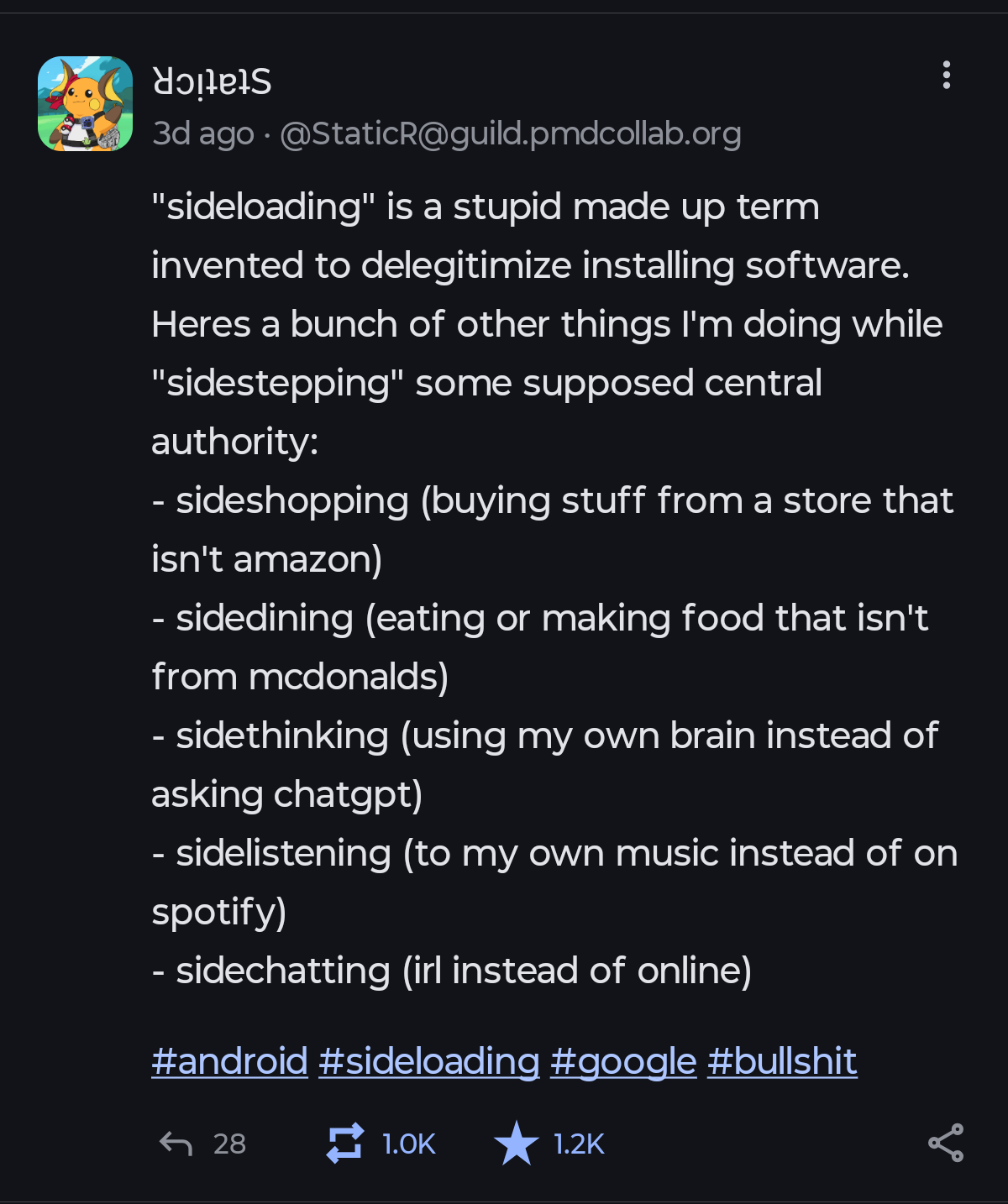 When I install software from the Arch User Repository I still just call it installing, even though it isn’t through the standard path. Everywhere else, you don’t make the distinction. For some reason on phones we’ve come to call it sideloading, even though the software is just software —it doesn’t care where it came from.