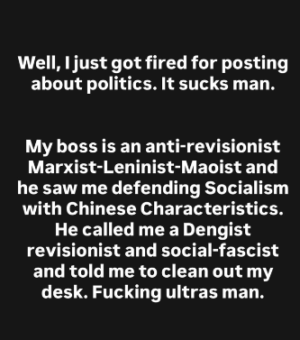 EZ rebuttal, he’s your boss and that means he’s a revisionist class traitor himself for participating in capitalism as a professional exploiter. If he gives you some shit about “but I have to exist within a capitalist system” you can lean over his desk with a big smile and say “Oh, like Deng Xiaoping?”