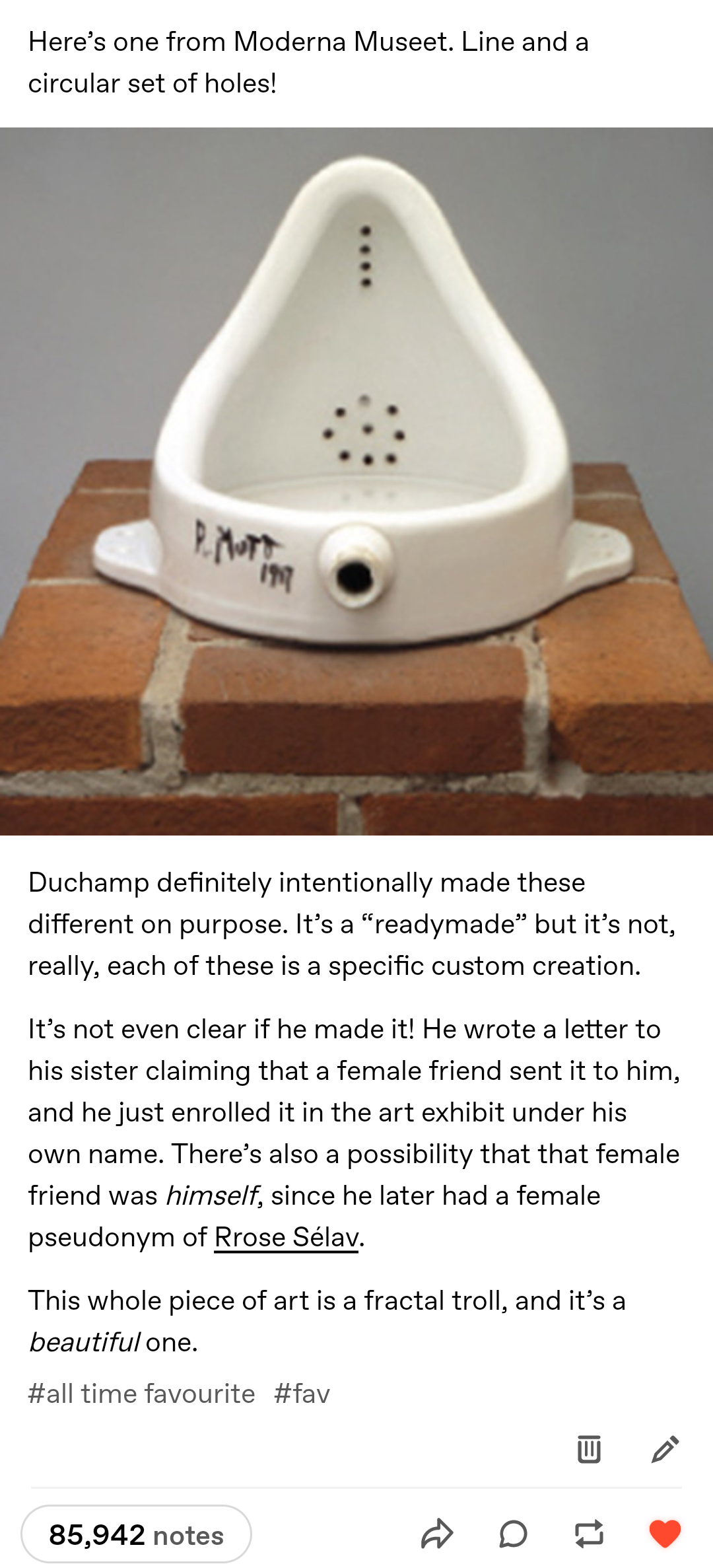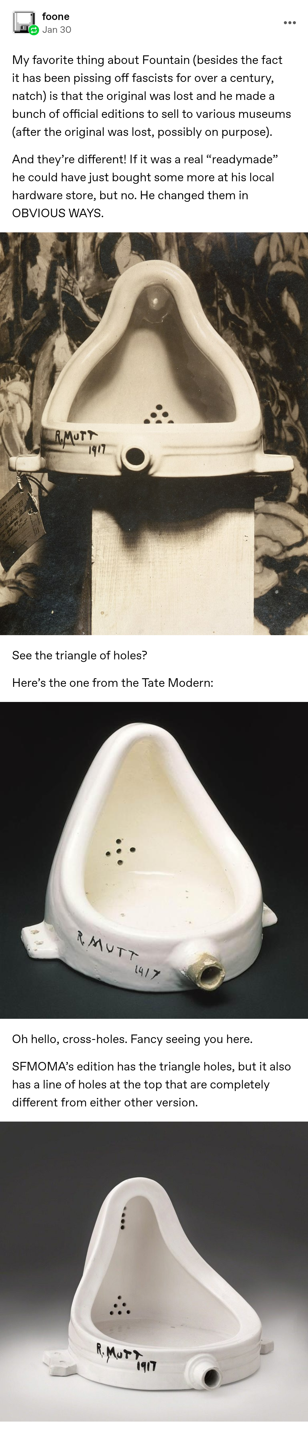 And whether or not he actually made it is kind of besides the point. Like the whole point of Fountain is it demonstrates that it doesn’t actually matter who the specific individual is who made the physical manifestation of the object which represents the artwork. Like even if he never made replicas of it, even if we knew with 100% certainty that he literally just bought a urinal and submitted it to an art show that “accepts all submissions” just to see if they really would accept it, it would not diminish its quality as an artwork at all. On the contrary, it would only better serve the point it’s trying to make.