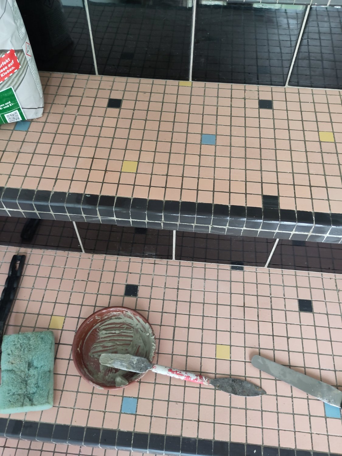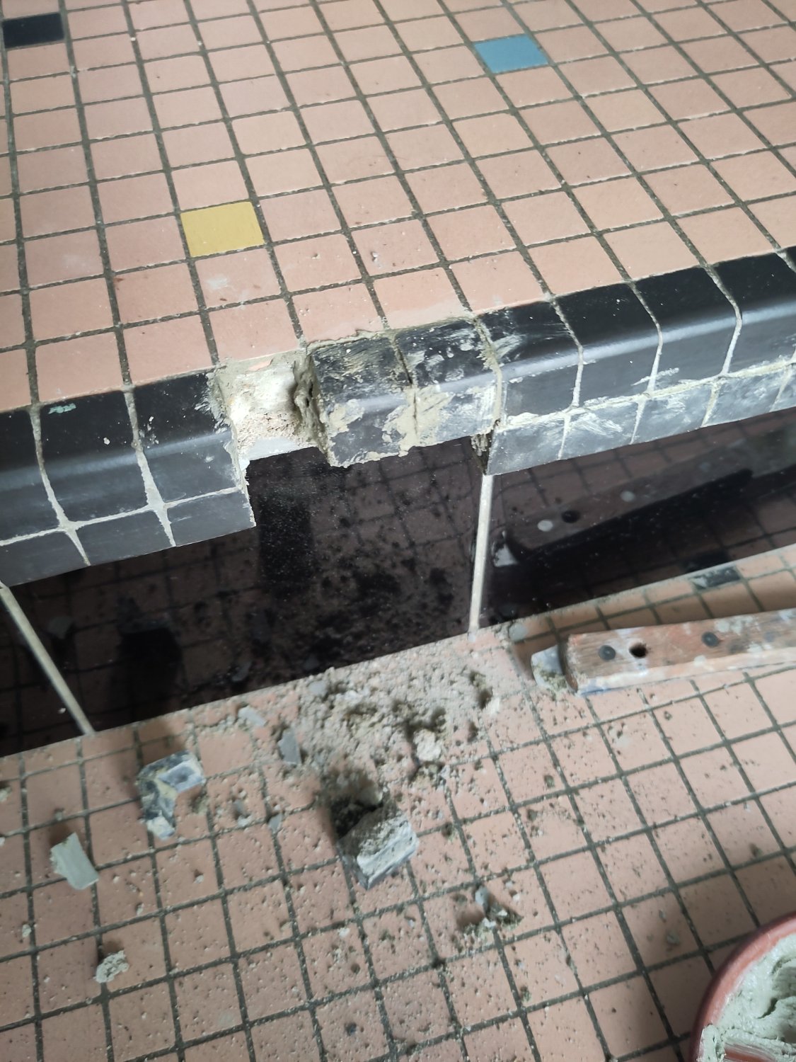 Thanks a lot for your reply! I’m not sure if I get it though. I attached another picture to my post that shows the step from the top. The part missing is a lot of material, I’m not sure how breaking everything up and glueing the tiles back should work. I’m confident that I could somehow model the little structure using some goey material and then glue the tiles back and apply grout but I’m not sure about the stability of this.