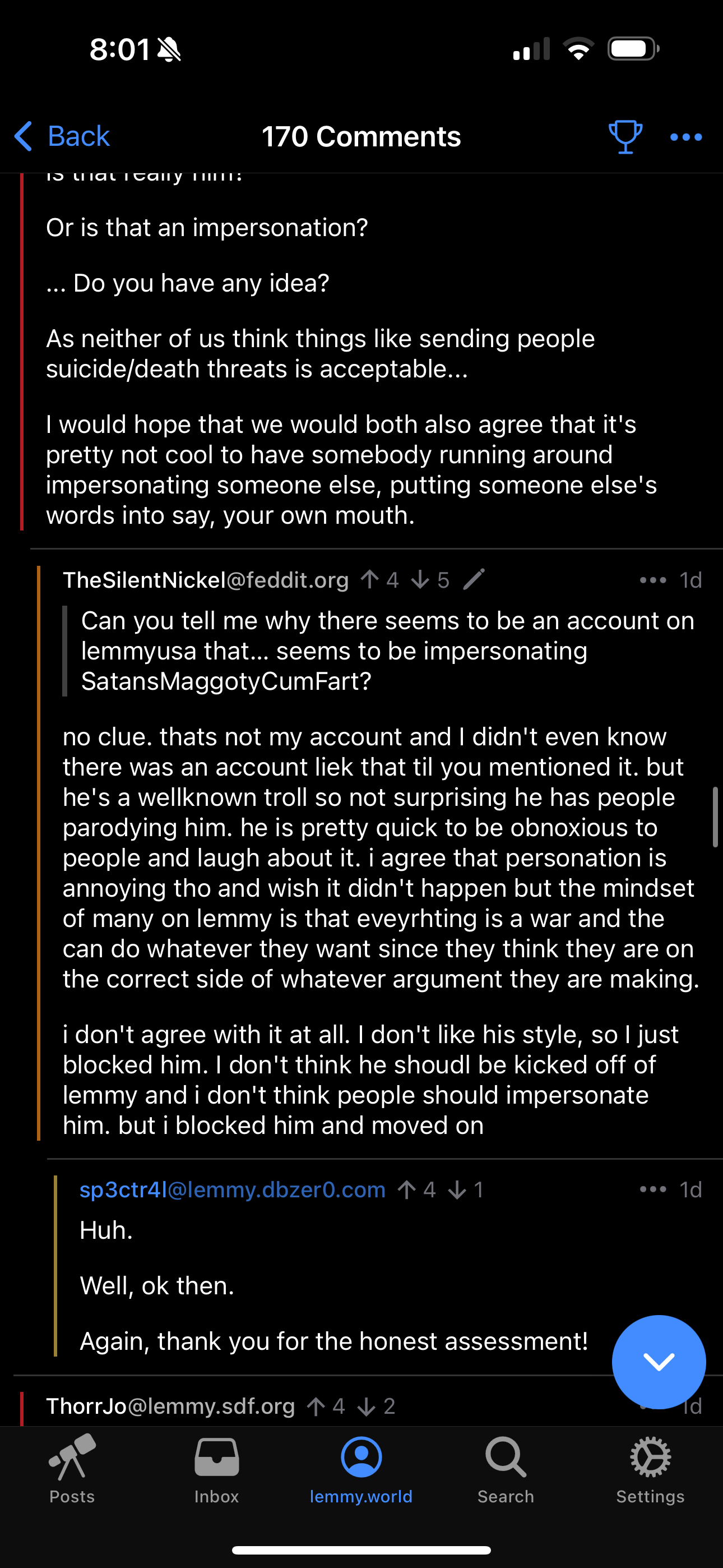 i don’t agree with it at all. I don’t like his style, so I just blocked him. I don’t think he shoudl be kicked off of lemmy and i don’t think people should impersonate him. but i blocked him and moved on
