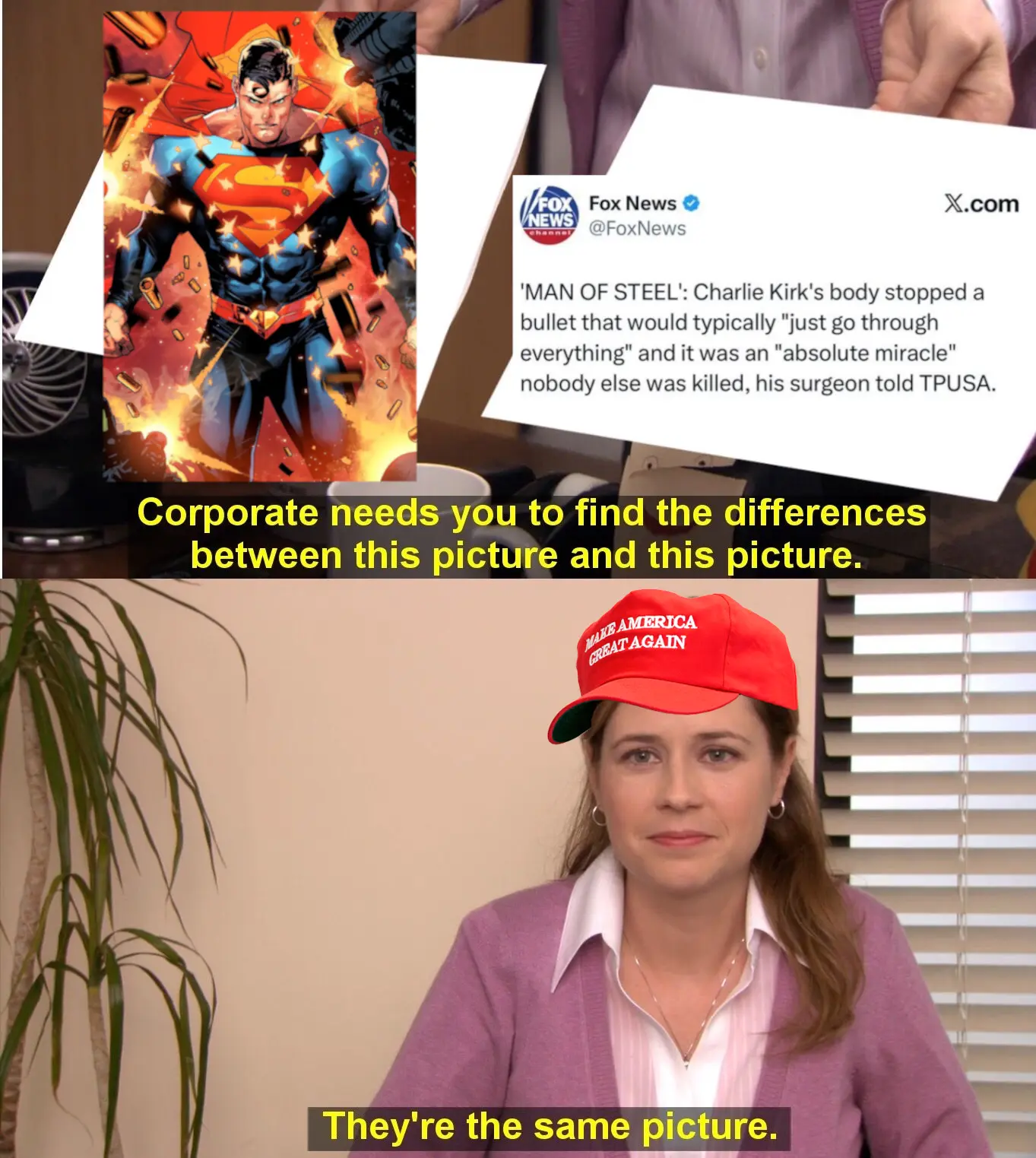 I think that’s satire, expanding the “Charlie Kirk = Superman” equivalency to the kind of shit CK would do, but Superman didn’t, showing the absurdity of the comparison.