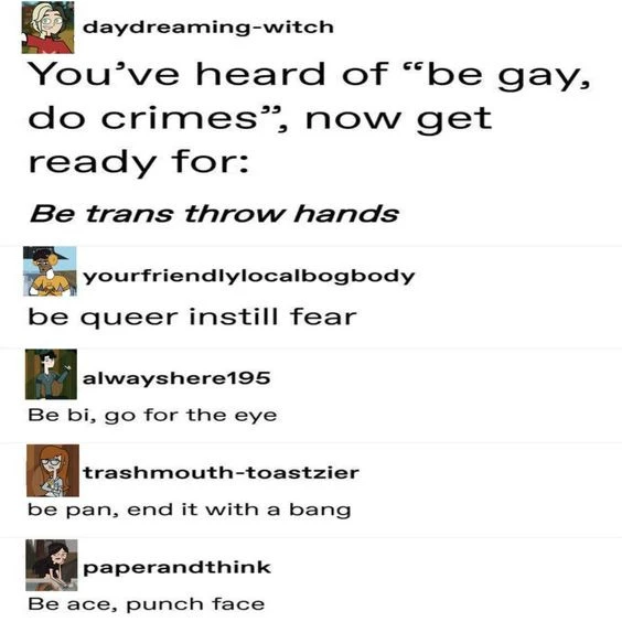 transcription: you’ve heard of be gay do crimes, now get ready for, be trans throw hands. be queer instill fear. be bi go for the eye. be pan end it with a bang. be ace punch face.