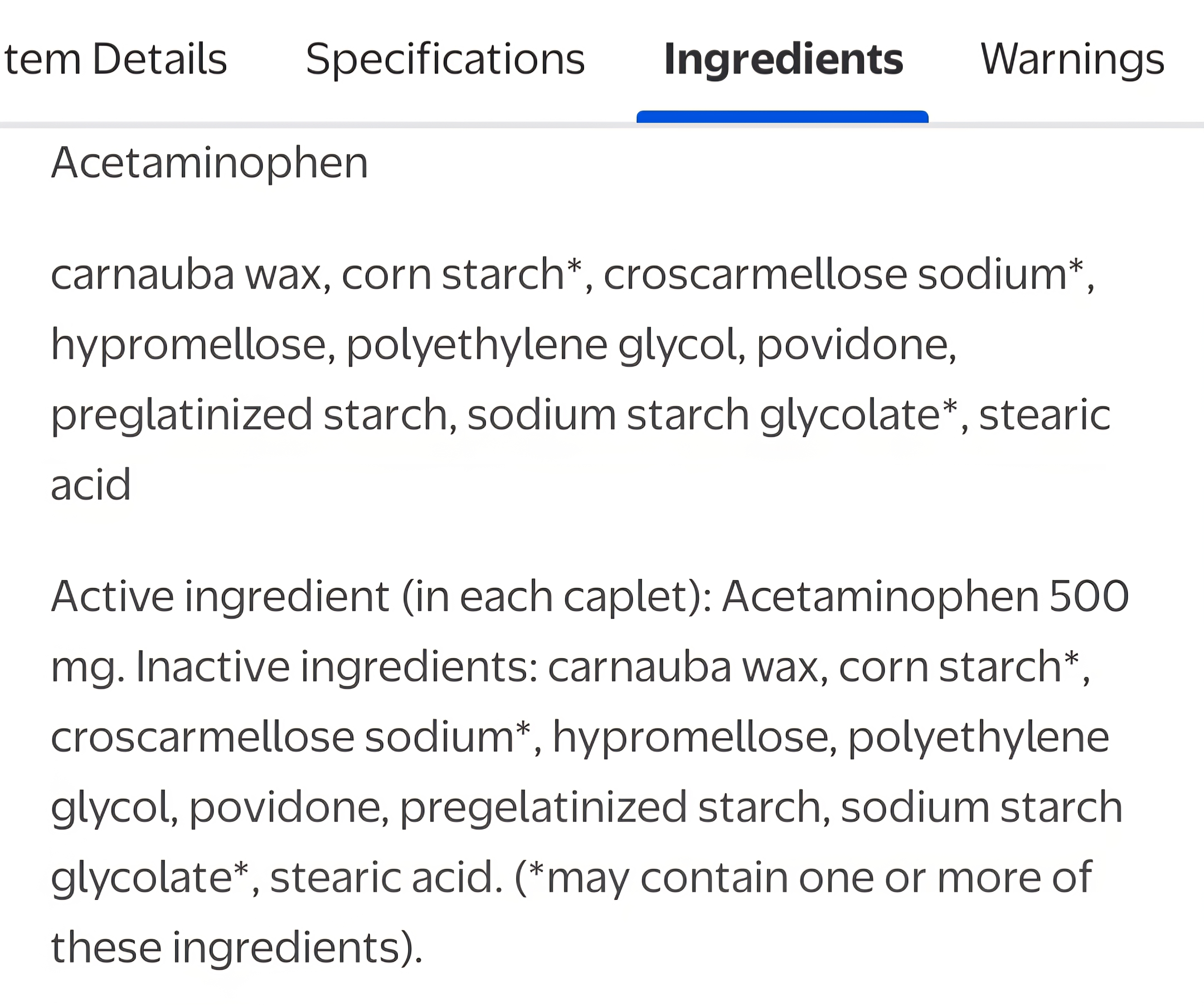 minus-squarejordanlund@lemmy.worldlinkfedilinkarrow-up5·edit-21 month agoI don’t think there’s anything special about the pills in Tylenol, not sure why they insist on namedropping that brand. Edit https://www.tylenol.com/products/headache-pain-relief/tylenol-extra-strength-caplets Acetaminophen 500 mg Pain reliever/fever reducer Inactive Ingredients carnauba wax*, corn starch*, FD&C red no. 40 aluminum lake, hypromellose, magnesium stearate, modified starch*, polyethylene glycol*, powdered cellulose, pregelatinized starch, propylene glycol, shellac, sodium starch glycolate, titanium dioxide *Contains one or more of these ingredients Compared with Walmarts generic, from app, won’t let me copy/paste: