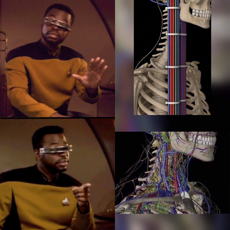 God wiring his new creation: … oh yeah I need a cable for the heart … oh yeah, I need a cable to power the lungs … oh yeah, almost forgot, need a cable for the liver … oh yeah, need a cable to control the legs … oh yeah, need some sensor lines for the hands … oh crap, wired the genital sensor lines wrong … oh shit, no more room for the lines for the kidneys, maybe if I wire it this way … shit, need more power lines for the stomach … crap, need more sensor lines here … shit, shit, shit, I need more power lines