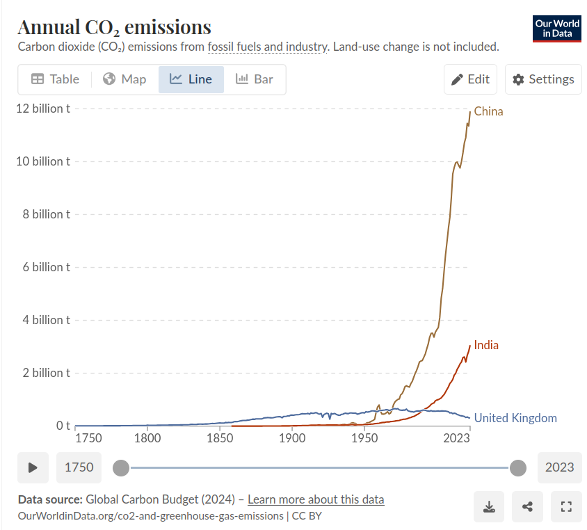 I think they’re just catching up to what countries like the UK did over the past 200 years. So a few hundred thousand more Indian people can afford cars or international holidays these days - that seems fair enough. what’s the indian GHG emisiions per capita? https://en.wikipedia.org/wiki/List_of_countries_by_greenhouse_gas_emissions_per_capita sorry still old data, but 2023 they were not much over half the UK , so what is the fair share of ghg emissions for a person in India? Any why should it be lower than , say, UK - who has a centuries old legacy of fucking the climate. The UK has a hell of a lot more reducing ghg per person to do before it can be any sort of role model -b and thats after nerfing it’s own heavy industry and not counting GHG embodied in imports.