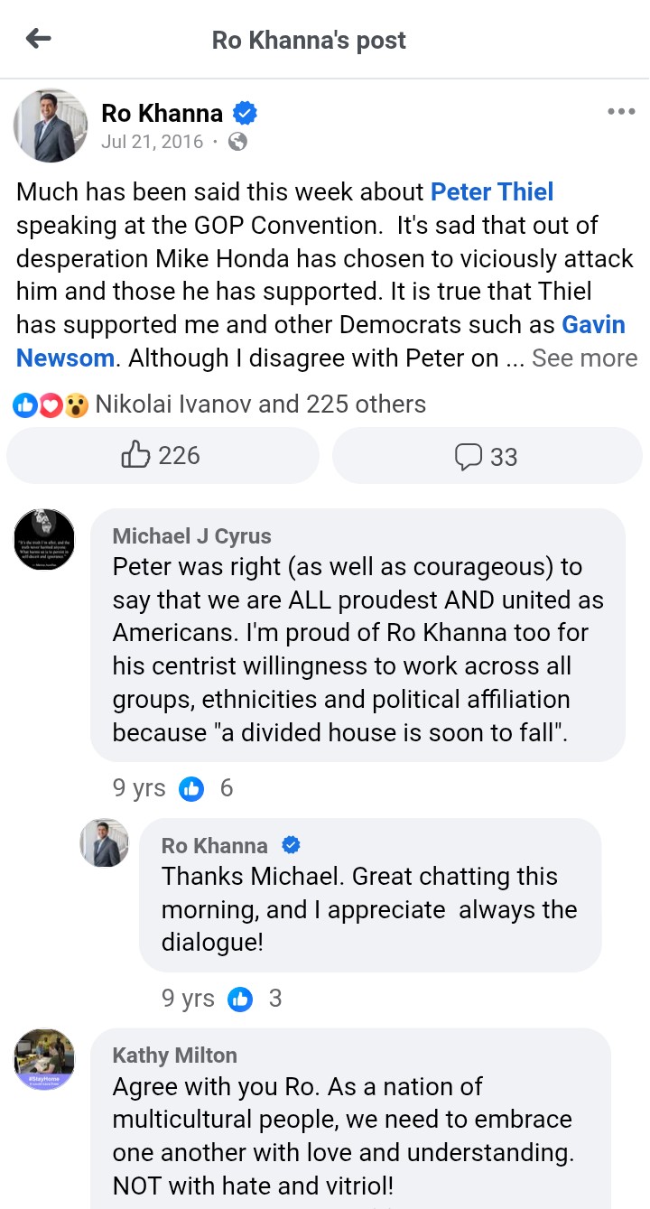 Ro Khanna is really good at pretending to be a decent human, but he’s also attended fund raisers hosted by David Sacks (JD Vance’s funder/creator) and been a sycophant for Peter Thiel for nearly a decade.