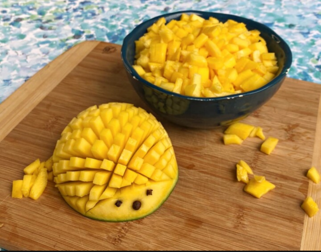 *What is cutting into cups? Sounds like a style of cutting/preparing but also could be just the receptacle you use to hold the mango, so I am confused by the ambiguity.