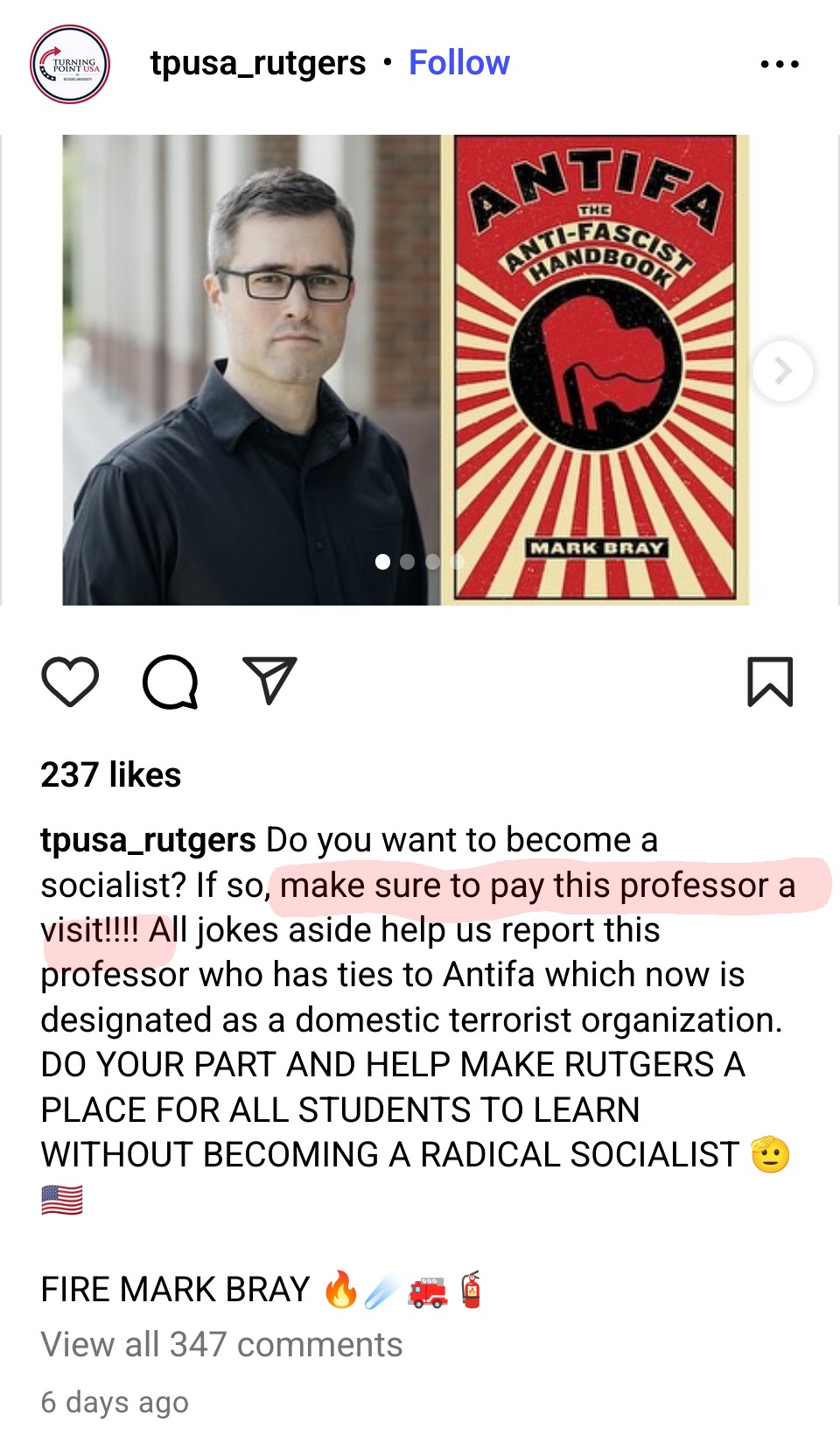 “Ties to antifa” is how fascist morons understand a professor who researches antifascist movements. And it sounds like some Rutgers students are among the morons. Could be one of them who called to cancel his booking. That’s better than it being the government or the airline doing it, but it still indicates that fascists are getting bolder and bolder.