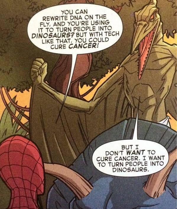 Spidey in the next panel: “Can the dinosaurs get cancer?”