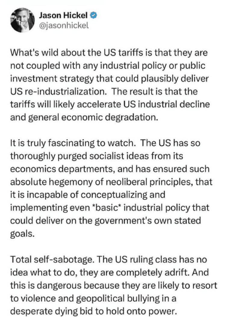 RockBottom@feddit.org to Late Stage Capitalism@lemmy.worldEnglish · 7 months agoJason Hickel on Tariffsimagemessage-square84linkfedilinkarrow-up1975arrow-down112