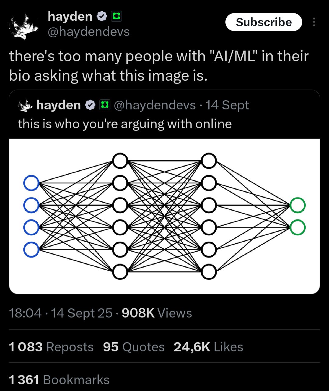Yeah, if you’re supposedly in AI/ML and don’t recognize a (stupidly simplified) diagram for a Neural Network, you don’t really make stuff with it, you’re just another user (probably a “prompt engineer”).