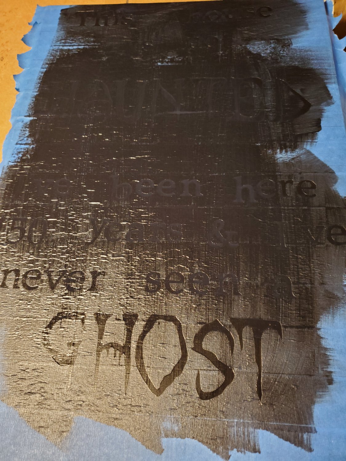 I took a piece of scrap plywood and painted it flat black. Then I covered it with painter’s tape, used stencils to lay out letters, and cut the letters out with an X-ACTO knife: