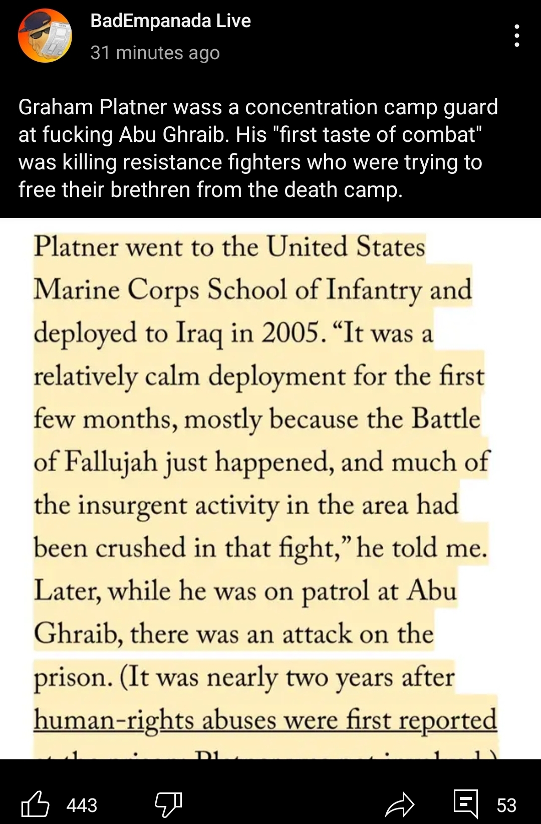 Also fun fact if the politician doesn’t care about killing brown kids in the Middle East they don’t care about you either. Platner is another Fetterman and you are collecting “fell for it again” awards.